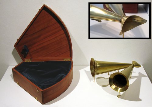 This instrument functions as an analogue amplifier. It harnesses the physics of a particular shape and volume to funnel sound into a concentrated area. A previously popular accoutrement of the aged and wealthy, this device has fallen from fashion with culture’s desire to suppress the visibility of an imperfect physiognomy.