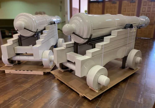 Work on the project began in 2016 with support from Boston’s USS Constitution Museum, who provided me with schematics for the guns and ship layout, and the John Michael Kohler Art Center’s Arts/Industry Program who awarded me a residency in the Kohler pottery factory in Wisconsin. I painstakingly fabricated all the parts for a gun - wooden patterns for casting multiples in clay at Kohler. Producing it (cheaply) is an achievement in engineering and execution that I’m tremendously proud of. The pottery technician and designers advised me that my project may prove impossible, as it was one of the most ambitious ever proposed in the 49-year history of the Program. With no funding to hire assistants, it was a physical challenge doing all the work myself but also exhilarating, and it honed my determination to succeed. I produced sixteen huge, heavy, multi-part plaster molds with steel infrastructures and handles to manipulate them solo with a hoist. Using them, I successfully slip-cast in vitreous china (liquid industrial porcelain) twenty-seven components to make a full cannon... twice! I made two cannon! Some of the components are the largest ever attempted at the facility. They look fantastic, exactly as I had imagined: huge, shiny white cannons with a toilet-like visual vernacular - a perfect balance of industrial manufactured product and fragility; they embody beauty and death simultaneously. [A presentation on the project is available]
