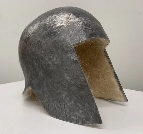 Modeled after 6th century B.C. Illyrian relics, forged from a single sheet, with protective cheek pieces and curving flange at the back. The felted fur lining from my beloved dog Killick (the best relationship I've known) further protects, insulates, and imbues her fierce, loving protection.